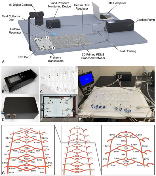 Experimental setup and components of the Pulsatile Unit for the Simulation of Arterio-embolic Restrictions (PULSAR) System: (A) The system is composed of a pulsatile pump attached to a 3D-printed polydimethylsiloxane dichotomously branched tubular network obeying Murray’s law of minimum work. The distal portion of the circuit is designed for simulation of the paramandibular facial artery and its proximal branches, with a vessel diameter ranging from 2 mm down to 1 mm. The circulating fluid, composed of 50% glycerol and water by volume, is stored in the fluid housing and recirculated within the system at 20 °C. Four different ports allow access to the system for inoculation (port 1), circulating fluid collection (port 3), and blood pressure monitoring (ports 1–4). The videographic capture of gel embolization employs a high-resolution digital camera tracking the movement of dyed gel particles against a lighted background. Two different regulators (return flow and outflow) allow for blood pressure and flow adjustments, which are tracked through a monitoring device connected to a receiving computer. Particle size analysis evaluated the gel-inoculated fluid directly sampled from the port 3 collection outflow. (B–F) System components showing the pulsatile pump, 3D-printed circuit, blood pressure monitoring device, distal circuit setup, and whole circuit setup, respectively. (G) Diagram of the tubular network showing the branch inner diameters.