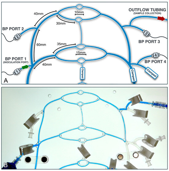 Following whole-system calibration, the circuit was further adjusted for facial artery simulation (Figure 15). Modifications included clamping the distal return tubing for the two distal vascular beds in order to isolate the distal network (encompassing the 2 mm-diameter tubing and its 1.6 mm-diameter daughter branches) for simulation of the proximal paramandibular facial artery in humans (diameter 0.9–2.5 mm) [65,66,67]. Repeat system calibration was again carried out, aiming to mimic physiological blood pressure while maintaining flow rates within the facial artery range (7.3–35.3 mL/min) [68,69,70,71]. Finally, upon completion, three different heart rate and stroke volume settings were established to span low (~10 mL/min), medium (~18 mL/min), and high (~36 mL/min) flow rates for the experimental system inoculations.