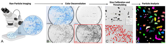 Schematic showing the protocol used to characterize HA gel fragments following inoculation into the PULSAR system: (A) High-resolution macroscopic and microscopic images of the HA gel fragments were taken for analysis in ImageJ. (B) Images underwent color-channel deconvolution. (C) The red channel images were calibrated and particles were thresholded. (D) Particle analysis was conducted on color-isolated images.
