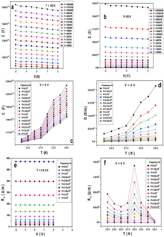 Figure 2a,b display the variation of the capacitance (C) and conductance (G) with the voltages and frequencies at a temperature of 303 K for the Au/PVA/SiO2/p-Si/Al structure. As observed in Figure 2a, the capacitance decreases with the frequency, while the conductance increases. C and G are still independent of the voltage changes. At the same time, the conductance might be attributed to the spreading profile of the interface density of states at the PVA/p-Si and PVA/SiO2 interface and series resistance (Rs) [18,19]. Figure 2c,d display the variation of C and G with the temperature at different frequencies and a constant voltage V = 0 V; both rise with the temperature. The variation of the series resistance (Rs) with the voltage at different frequencies at room temperature is seen in Figure 2e; it decreases with the frequencies, while Rs shows peaks at room temperature, as displayed in Figure 2f, and then decreases at high temperatures.