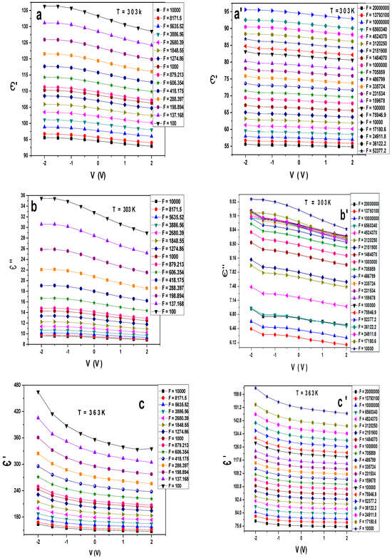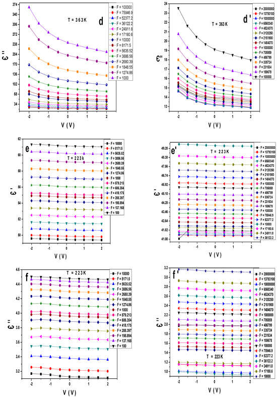 Figure 3a–b’ display the variation of the dielectric constant Є′ and Є″ at different frequencies and room temperature for Au/PVA/SiO2/p-Si/Al. It is seen that Є′ decreases with the frequencies, and its value ranges from 56 to 135, while the dielectric loss Є″ decreases with the frequency, taking values from 6 to 36. Here, we enhanced the values of Є′ and reduced the values of Є″, as shown in Figure 3b,b’. At a temperature of 363 K, Є′ increases from 75 to 480 while Є″ reduces from 13 to 380, as illustrated in Figure 4c,d. On the other hand, working at a low temperature equal to 223 k, the values of Є′ and Є″ range from 41 to 60 and from 1 to 4.4, respectively, as illustrated in Figure 3e–f’. As described above, we can increase the dielectric constant’s value and reduce the dielectric loss’s value with varying temperatures and frequencies. Still, their values are independent of the change in the voltage. It is stated that the values of Є′ and Є″ depend on several factors related to the interface state density, interfacial layer thickness, series resistance, doping concentration, etc. [17,20].
