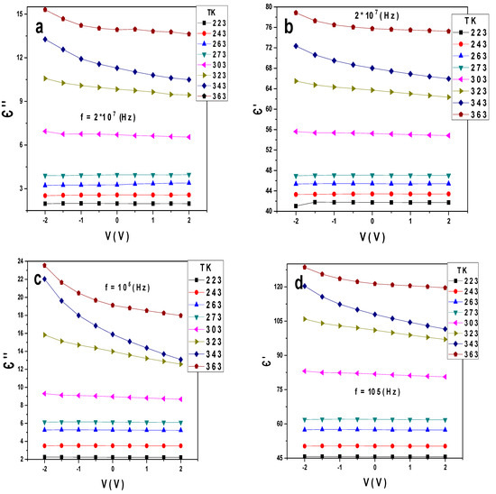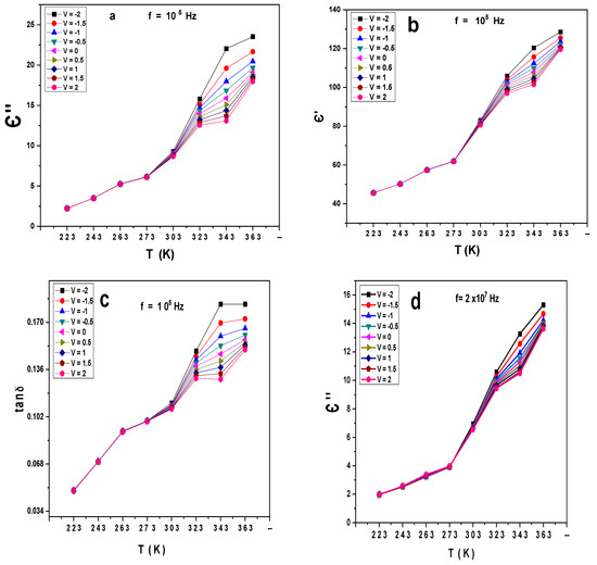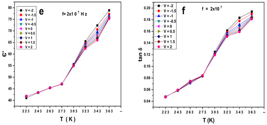 Figure 6a–f illustrate the variation of Є′, Є″, and tanδ with the temperature at different voltages and frequencies for the Au/PVA/SiO2/p-Si/Al structure. Є′, Є″, and tanδ increase with the temperature. All the curves overlap at low temperatures, while at room and high temperatures, the Є′, Є″, and tanδ curves split at each voltage. At the frequency 105 Hz, the values of Є′ increase from 40 to 140, while Є″ and tanδ reduce from 0 to 25 and 0.04 to 0.2, respectively, as displayed in Figure 6a–c. As the frequency increases to 2 × 107 Hz, the values of Є′, Є″ and tanδ range from 40 to 80, 0 to 16, and 0.04 to 0.2, respectively, as shown in Figure 6e,f. The impurities, disorders, or additional phases might be clarified in the construction. With an increase in temperature, the joint effect leads to a rise in the values of Є′ and Є″. This may be attributed to the ion jump and space charge effects induced by rising concentrations of the charge carriers. Also, the rising temperature enhances the growth of molecules. It can be supposed that this structure enhanced the dielectric properties Є′, Є″, and tanδ with annealing [25,26]. It is clear that with increasing frequency, Є′ has shown significant improvements, while Є″ and tanδ are decreased, increasing capacitors’ ability to store energy and reduce heating loss.