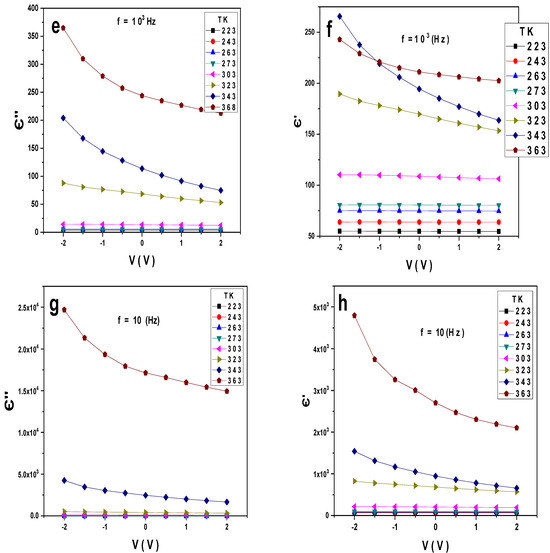 (a–h) Є′, Є″ versus V at different temperatures and constant frequencies for the Au/PVA/SiO2/p-Si/Al structure.