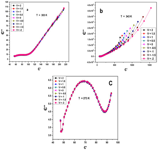 Figure 7 displays the variation of the dielectric loss (Є″) with a dielectric constant (Є′) of impedance at different voltages and constant temperatures for Au/PVA/SiO2/p-Si/Al. Entirely, the figures display a reduction in the radius of the partly shaped semicircles and shrinkage near the origin due to the rising ionic conductivity and declining resistance of the films [27,28].