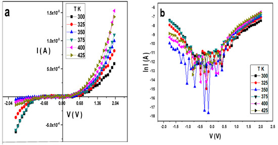 Figure 8a illustrates the I–V characteristic for the Au/PVA/SiO2/p-Si/Al heterostructure diode at different temperatures, while Figure 8b displays the diode’s lnI–V semilogarithmic behavior.