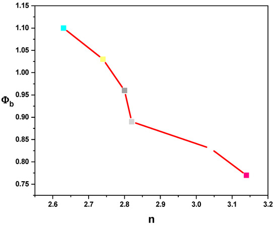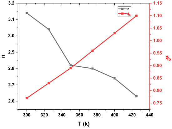 From Equations (1) and (2), ɸb increases with the temperature, while n decreases, as illustrated in Figure 9, and their values are listed in Table 1. Based on Equation (3), the high value of the ideality factor was attributed to the presence of a thin oxide layer and series resistance [23]. Since the non-homogeneous barrier height contributes to the higher value of the ideality factor [35,36], the higher value of n can be explained in terms of secondary mechanisms such as border dips and interfacial imperfections, which are produced by an organic interlayer or a specific border structure [37]. The variation of the barrier height with the ideality factor is illustrated in Figure 10.