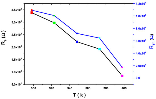 Rs and Rsh versus T for the Au/PVA/SiO2/p-Si/Al structure.