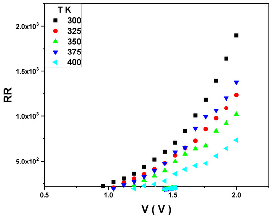 RR versus V at different temperatures for the Au/PVA/SiO2/p-Si/Al structure.