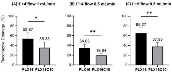 Percentage of fluconazole drained in the OphthalMimic device for the PLX16 and PLX16C10 formulations using a polymeric membrane (n = 6): (A) for 1 min of contact with the membrane without flow, followed by 4 min of continuous lacrimal flow at a 1 mL/min rate; (B) for 1 min of contact with the membrane without flow, followed by 4 min of lacrimal flow at a rate of 0.5 mL/min; (C) for 1 min of contact with the membrane without flow, followed by 9 min of lacrimal flow at a rate of 0.5 mL/min. Statistical analysis using a t-test confirmed significant differences between the formulations. * p < 0.05; ** p < 0.01.