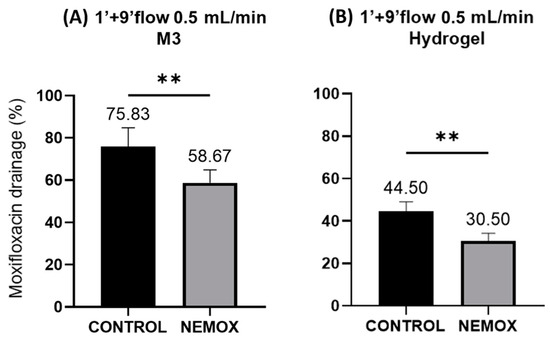 Percentage of moxifloxacin drained in the OphthalMimic device (n = 6): (A) moxifloxacin drainage using polymeric membrane without artificial eyelid; (B) moxifloxacin drainage using hydrogel membrane with artificial eyelid. Statistical analysis using a t-test confirmed significant differences between the formulations. ** p < 0.01.