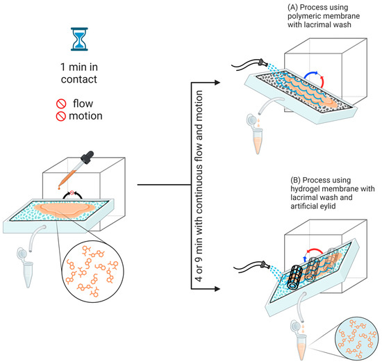Schematic representation illustrating the washing process carried out by the OphthalMimic device. The process entails the application of a formulation above the membrane, a one-minute rest period, and the initiation of the washing process utilizing artificial tear flow for either 4 or 9 min, with or without the utilization of an artificial eyelid.
