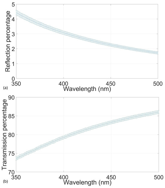 Figure 1 shows a plot of the percentage of reference light transmitted through the samples and the percentage reflected from them. The spectrum between 350 nm and 500 nm was selected because, within it, most of the endogenous tissue fluorophores can be found [42,43,44,45,46], which is of interest for applying these phantoms in the development, experimental evaluation, and characterization of fluorescence imaging systems for brain monitoring and neurological applications.
