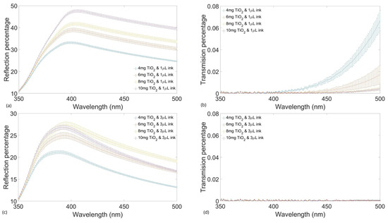 Figure 2 shows the plots of the transmission and reflection percentage of the reference light of the films with different amounts of TiO2 and two different concentrations of ink. The graphs present the mean and standard deviation of the samples, showing the reliability of the fabrication process.