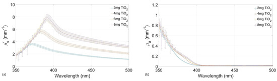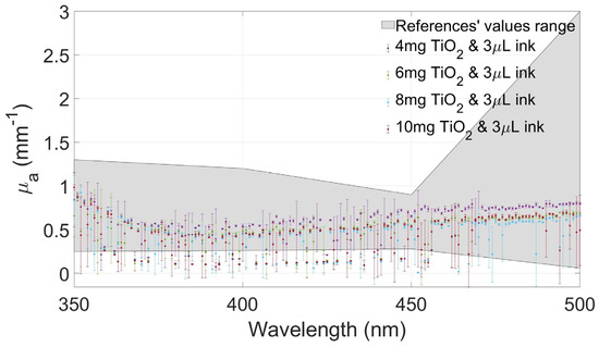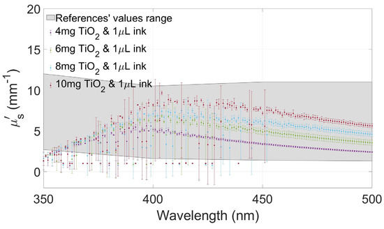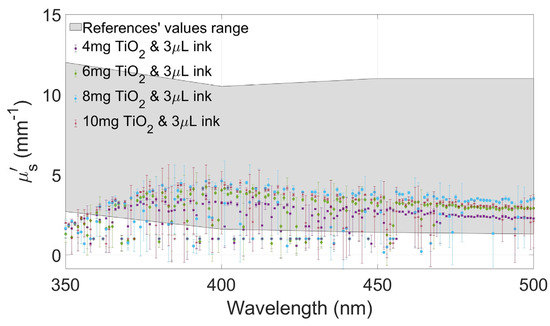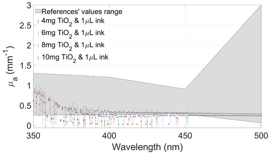 Figure 4, Figure 5, Figure 6 and Figure 7 show the values of and of the developed films and their standard deviation with the four selected concentrations of TiO2 with an ink concentration of 1 µL/mL in Figure 4 and Figure 6 and with an ink concentration of 3 µL/mL in Figure 5 and Figure 7. In these graphs, the maximum and minimum values obtained from biological brain tissue [22,23,24,25,26] are plotted as a range, illustrated as the gray area in the figures, for comparison with the values from this study. For plotting these ranges, only data points at 350, 400, 450, and 500 nm wavelengths were used.