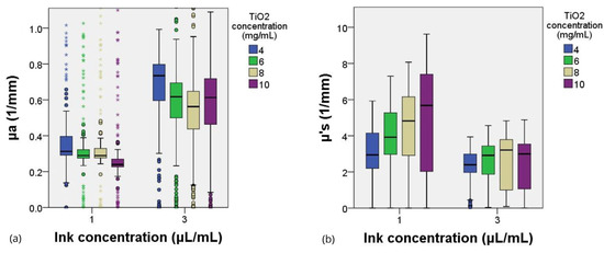 Figure 8 shows the differences in the values of reduced scattering and absorption between the different concentrations of TiO2 grouped by the ink concentration. It can be seen that the differences in absorption are larger than those in scattering between the two groups of ink concentrations. In addition, it shows how the reduced scattering coefficient values increase as the scattering agent concentration increases.