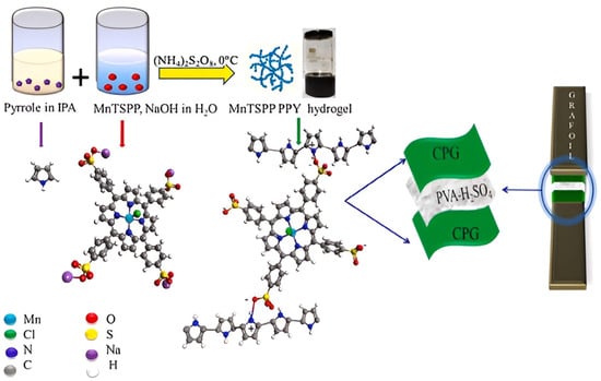 A different synthesis process of conducting polymer hydrogel (CPH) is described below. Because of the interest in the synthesis of CPH, researchers have developed many synthetic approaches for their fabrication such as (i) the polymerization of the monomer in non-conductive frameworks and templates by in situ chemical or electrochemical means; (ii) adding cross-linking agents, like phytic acid, to the polymer backbone; and (iii) co-polymerizing the monomers of a conductive polymer and non-conductive one [61,76,77]. For instance, 3D polyaniline/phytic acid supramolecular hydrogels were synthesized by the electrochemical polymerization technique [65]. To demonstrate the versatility of phytic acid for the synthesis of 3D CPHs, Shi et al. [78] prepared a conducting PPy hydrogel by an interfacial polymerization method where the synthesis was complemented by an aqueous/organic biphasic line. For the synthesis of PPy hydrogels using 5, 10, 15, 20-tetrakis (4-sulfonatophenyl)−21H, 23H-porphine manganese (III) chloride (MnTSPP) as a dopant and cross-linker was used by Das et al. [67]. The supramolecular synthesis approach of the PPy hydrogel, employing MnTSPP as a cross-linker and dopant, is schematically represented in Figure 5.