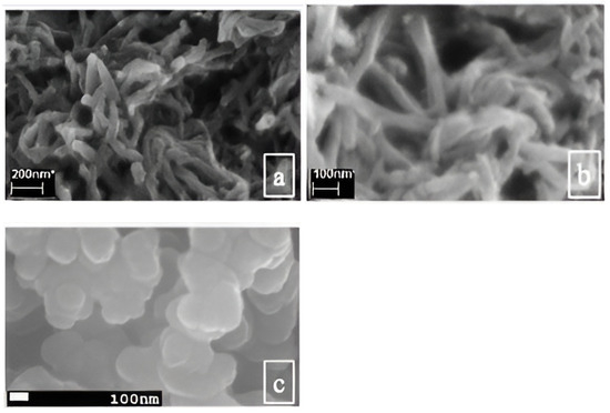 It is possible to change the chemical and physical properties of the dopant molecule cross-linked CPGs. By altering the cross-linker employed in the synthesis process, it is feasible to modify the dopant molecule cross-linked CPGs’ chemical and physical properties. On the other hand, indigo carmine and indigo carmine dehydrate were used to attain PPy gels with a granular nanostructure and a 1D nanostructure that was “necklace-like” [79]. A similar morphology of the nanostructured PPy is displayed in Figure 6b,c. The electrical and electrochemical characteristics of the generated CPGs are significantly influenced by these diverse microstructures, which is significant for their applications in supercapacitors. Furthermore, the shape and thermal characteristics of CPGs can be further regulated by maintaining the synthesis parameters, including the temperature, solvent ratio, and precursor ratio. Thus, the microstructural characteristics of PPy gels can be adjusted by using various kinds of organic solvents and varying the ratio of monomers to cross-linkers [81].