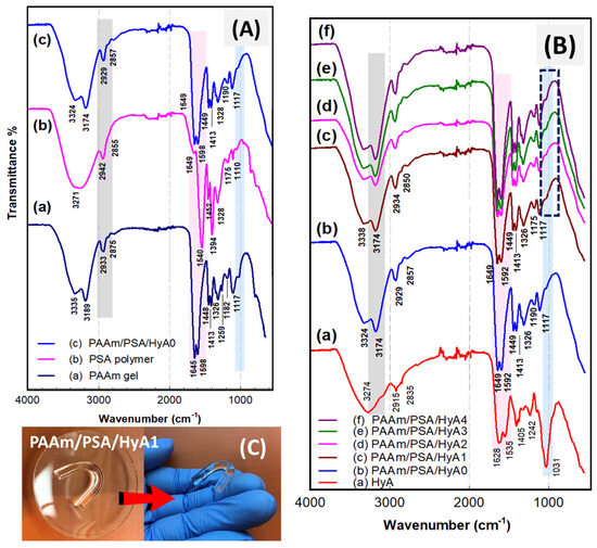 ATR−FTIR of (A) PAAm gel, linear PSA polymer, and HyA−free control gel, PAAm/PSA/HyA0, (B) neat hyaluronic acid (HyA) and PAAm/PSA/HyA semi−IPNs prepared with varying HyA contents. (C) As−prepared state appearance of 0.05% (w/v) HyA−containing PAAm/PSA/HyA1 semi−IPN sample synthesized at ambient temperature.