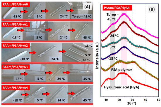 (A) As−prepared-state images of PAAm/PSA/HyA semi−IPNs synthesized at different polymerization temperatures after their removal from the syringe. (B) XRD curves of semi−IPNs as a function of the composition.