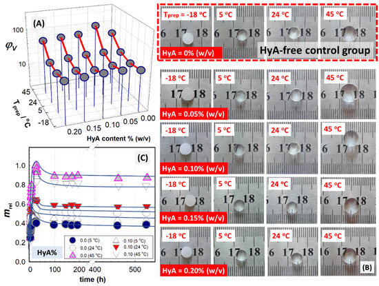 (A) Variation of experimental and theoretical values of volume fraction of crosslinked polymer network after preparation and (B) the gel fraction of PAAm/PSA/HyA semi−IPNs as a function of the polymerization temperature, as well as HyA content after complete drying. (C) Optical views of HyA−free control gel, PAAm/PSA/Hy0, synthesized at 24 °C.