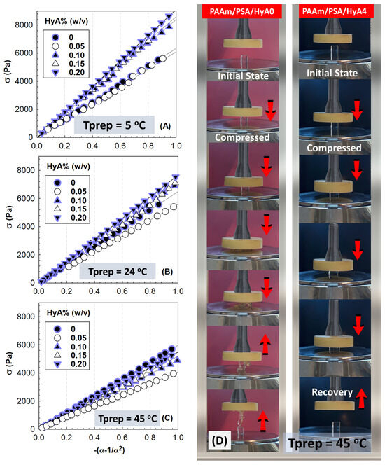 (A–C) Stress−compressive strain isotherms of PAAm/PSA/HyA semi−IPNs after their preparation at 5, 24, and 45 °C. HyA content. (D) Optical images of 0.20% (w/v) HyA−containing semi-IPN gels prepared at 45 °C during uniaxial compression testing.