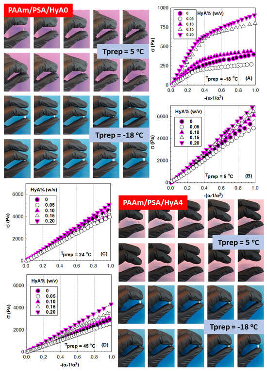 (A–D) Stress-compressive strain isotherms of semi-IPN PAAm/PSA/HyA gels after their equilibrium swelling in water. HyA content. Optical views of gels formed at different conditions after finger compression.