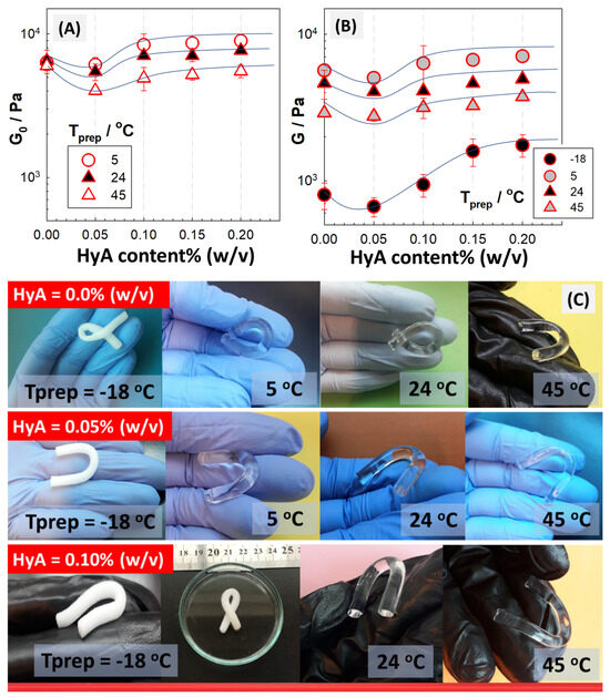 In Figure 4, the equilibrium volume swelling ratio of PAAm/PSA/HyA semi-IPNs is shown as a function of HyA content, as well as the gel preparation temperature. The results were obtained with a large number of samples, including sixteen samples for HyA-containing PAAm/PSA/HyA gels and four samples for the HyA-free control group PAAm/PSA/HyA0, prepared under the same conditions and analyzed by following their swollen diameter. Both the polymerization temperature and the amount of HyA have an impact on the swelling capacity of semi-IPNs. Optical images of semi-IPN gels prepared at different temperatures after their swelling in water were presented. When a small amount of HyA, 0.05% (w/v), was added to the semi-IPN structure, the swelling first increased but then decreased with further increasing HyA content. The results indicated that high HyA concentrations may not be necessary to improve the swelling. Based on the behavior of semi-IPNs, the swelling results in Figure 4A are evaluated by dividing it into two areas. The first one is located between ambient temperature and −18 °C, while the second one is located beyond ambient temperature and at 45 °C. The swelling ratio of semi-IPNs formed at higher polymerization temperatures than ambient temperature is the highest, while the swelling ratio decreases as the temperature decreases. However, the swelling ratio of semi-IPN gels formed at temperatures below the freezing point of the polymerization solvent is higher than or close to ambient temperature conditions. Figure 5B presents the optical images of semi-IPN PAAm/PSA/HyA gels after their swelling in water. In addition to the effect of chemical composition on the swelling ability of gels due to the change in HyA content, their morphological structure change depending on the polymerization temperature. In the syntheses carried out at −18 °C, below the freezing point of water used as polymerization solvent, the PAAm/PSA/HyA gels appear opaque due to the formation of a porous structure as a result of cryogelation. However, PAAm/PSA/HyA gels synthesized at higher polymerization temperatures appear transparent, indicating the homogeneous network formation.