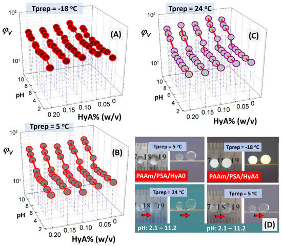 (A–C) Equilibrium volume swelling ratio of PAAm/PSA/HyA semi−IPN shown as a function of pH of swelling medium, as well as gel preparation temperature. (D) Optical images of semi−IPN PAAm/PSA/HyA after their swelling in acidic and basic pH conditions.