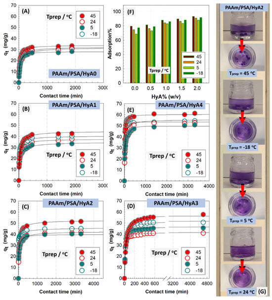 The adsorption performance (A–E), and adsorption capacity (F) of HyA-integrated PAAm/PSA/HyA gels as a function of contact time at different preparation conditions. (G) Optical images of HyA-integrated PAAm/PSA/HyA gels after 1 h adsorption of MV dye.