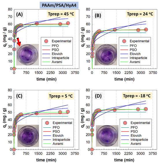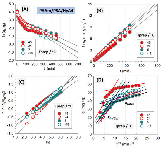 Results of nonlinear PFO kinetic model, PSO kinetic model, Avrami, Elovich kinetic model, and intraparticle diffusion model of 0.20% (w/v) PAAm/PSA/HyA4 semi−IPN gels formed at polymerization temperatures of Tprep (°C): 45 (A), 24 (B), 5 (C) and −18 (D).