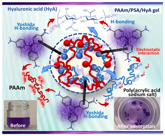 Illustration of the possible interactions between MV dye and HyA-containing PAAm/PSA/HyA semi-IPNs.