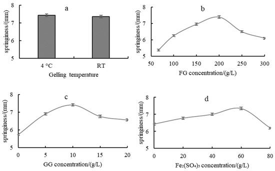 | Number | A. FG Concentration /(g/L) | B. GG Concentration /(g/L) | C. Fe2(SO4)3 Concentration /(g/L) | Y. Springiness /(mm) |