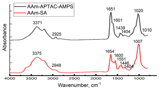Figure 3 shows the FTIR spectra of AAm95-SA5 and AAm95-APTAC2.5-AMPS2.5 hydrogels.