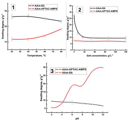 As shown in Figure 6(1), the SD of hydrogels does not significantly depend on ambient temperature within the range of 20 to 80 °C. This observation aligns with previous findings by other researchers [54]. The stability of the studied systems under high-temperature conditions is evidenced by the DSC and TGA results published in our previous works [48,49]. It has been established that the studied systems remain stable up to a temperature of 150 °C. The SD of AAm95-SA5 hydrogel was notably higher, reaching up to 26 g∙g−1. This elevated SD is attributed to the presence of sodium acrylate groups, which expand thereby stretching the polymer network. In contrast, the AAm95-APTAC2.5-AMPS2.5 hydrogel exhibited a lower SD of approximately 18 g∙g−1. This reduced swelling was due to the electrostatic attraction between the oppositely charged monomers within the polymer matrix [55].