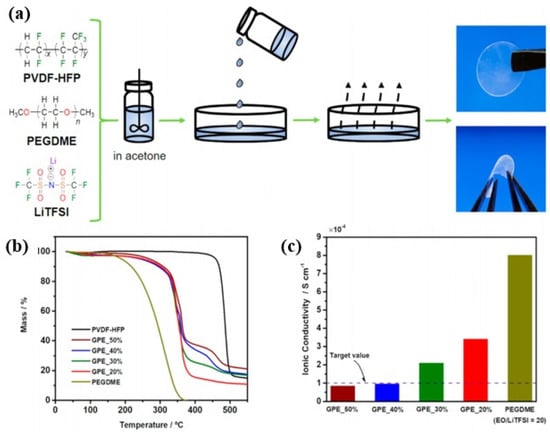 (a) Schematic illustration of preparation process, (b) TGA results, and (c) ionic conductivity at RT of GPEs with different percentages of PVDF-HFP content; adopted from ref. [33].