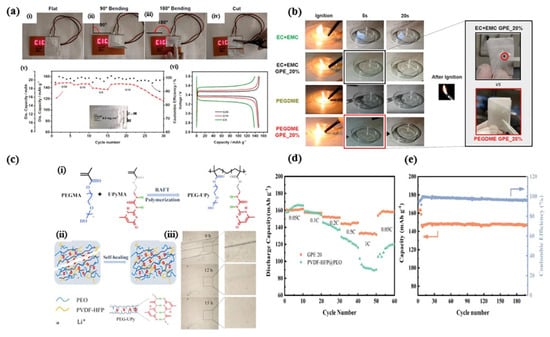 (a) Flexibility and safety tests of the Li0/GPE_20%/LFP pouch cell using LED lighting: (i) initial state, (ii) at 90°, (iii) at 180°, and (iv) post-cutting. It also includes (v) battery performance and (vi) charge/discharge characteristics at different C-rates. (b) Illustrates the flammability test conducted on EC + EMC and PEGDME solvents alongside their respective gel polymer electrolytes; adopted from ref. [33]. (c) (i) Represents the schematic synthesis process of the brush-like copolymer PEG-UPy. (ii) Illustrates the formation of PP-PU along with its self-healing mechanism at the surface of the cut. (iii) Presents optical images illustrating the self-healing process of PP-20PU samples under normal conditions. (d) Compares the discharge-specific capacity of Li/GPE-20/LFP and Li/PVDF-HFP@PEO/LFP configurations cells across different rates. (e) Demonstrates the cycling efficiency and coulombic efficiency of Li/GPE-20/LFP cells when tested at 1 C. Reprinted with permission from [34]. Copyright © 2022, American Chemical Society.