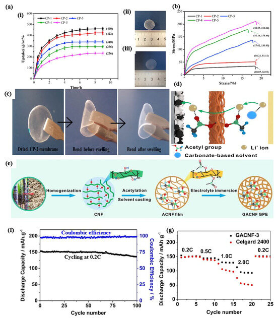 W. Wang and his team developed an innovative nanocellulose-based gel polymer electrolyte (GPE) customized for lithium-ion batteries. By acetylating cellulose nanofibers (CNFs) and using solvent casting, followed by electrolyte immersion, they created GPE films with high electrolyte uptake (301%) and noteworthy mechanical strength, flexibility, and thermal stability. The movement of lithium ions within the GACNF GPE is shown in Figure 4d. The preparation of ACNF films involved solvent casting followed by immersion in liquid electrolyte, resulting in variants labeled ACNF-1, ACNF-2, and ACNF-3. Figure 4e provides a diagram of the preparation process and subsequent analysis of battery properties. Test results showed that the Li/GPE/LiFePO4 battery retained 88.8% capacity following 100 cycles at a 0.2 C rate. Additionally, the GACNF-3 demonstrated a rate capacity on par using the Celgard 2400 separator, as depicted in Figure 4f,g. These findings underscore the potential of acetylated CNF-based GPEs in high-efficiency lithium-ion batteries, pointing towards advances in quasi-solid and solid polymer electrolytes [38].