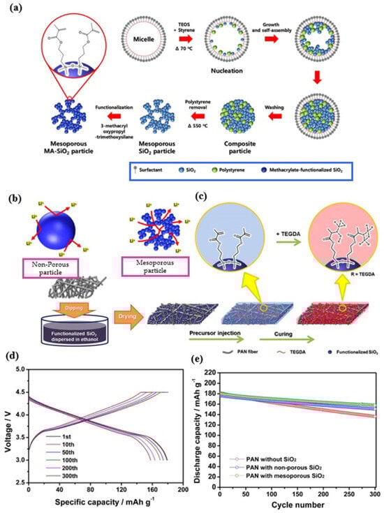 (a) Synthesis of mesoporous MA-SiO2 particles. (b) Varied lithium-ion transport characteristics with non-porous and mesoporous MA-SiO2 particles in the composite gel polymer electrolyte. (c) Development of the crosslinked composite gel polymer electrolyte utilizing a fibrous PAN membrane, mesoporous MA-SiO2 nanoparticles, and a gel electrolyte precursor featuring TEGDA. (d) Charge and discharge profiles of a lithium-ion polymer cell utilizing a crosslinked composite gel polymer electrolyte with mesoporous MA-SiO2 nanoparticles. (e) Discharge capacities of lithium-ion polymer cells using various electrolytes at 25 °C, adopted from ref. [44].