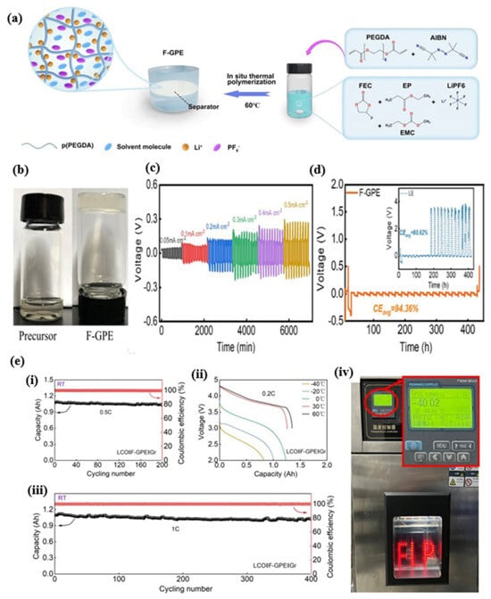 H. He and colleagues conducted research on creating a highly effective fluorinated gel polymer electrolyte (F-GPE) using poly(ethylene glycol) diacrylate (PEGDA) as a crosslinking agent [45]. The process of preparing F-GPE by in situ thermal polymerization is shown in Figure 6a. The F-GPE displayed impressive electrochemical stability across an extensive voltage range of 2–5.6 V and maintained high ionic conductivity even at −40 °C. The optical image of F_GPE is shown in Figure 6b. This study emphasized the F-GPE’s capability to perform well at low temperatures while improving stability and electrochemical characteristics at elevated temperatures, making it a promising choice for large-scale lithium-ion battery applications across varying operating temperatures. In Figure 6c, the Li||F-GPE||Li cell showed stable overvoltage during Li stripping/plating at a current density of 0.5 mA cm−2, demonstrating remarkable interface compatibility of the GPE with Li metal. Figure 6d depicts the average coulombic efficiency of Li||Cu cells utilizing F-GPE and LE to assess Li plating/stripping behavior. The electrochemical performance of a complete battery with PEGDA-based electrolytes in LIBs was analyzed, revealing good cycling behavior with capacity retention rates of 95.3% after 200 cycles at 0.5 C and 92.9% after 400 cycles at 1 C, as seen in Figure 6e in section (i–iv). Herein, lithium cobalt oxide (LCO) was the testing electrode.
