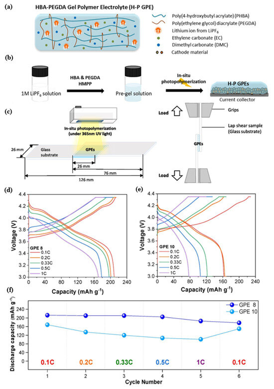 (a) Schematic diagram of the HP GPEs, which are innovative gel polymer electrolytes (H-P GPEs) derived from poly (4-hydroxybutyl acrylate) (PHBA). (b) Preparation of the H-P GPEs. (c) Adhesion properties of the H-P GPEs. (c) Schematic diagram illustrating the sample preparation procedure (left) and characterization (right) for the lap shear test. (d,e) Charge/discharge curves at different current rates of the electrochemical characteristics of GPE8 and GPE10 in half-cell battery configurations. (f) Rate cycling performance ranging from 0.1 C to 1 C; reproduced with permission from ref. [46], Elsevier.