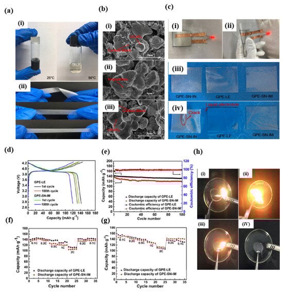 (a) (i) SN electrolytes at 25 °C and 50 °C, highlighting the change from a paste-like to a liquid state. (ii) Flexible and stretchable characteristics of the GPE-SN-IM film. (b) SEM images of the fresh LiCoO2 cathode and the cathodes from cells utilizing GPE-LE and GPE-SN-IM after 100 charge–discharge cycles at 55 °C, showing differences. (c) (i) Battery lighting up an LED with LiCoO2/GPE-SN-IM/Li4Ti5O12; (ii) GPE-SN-IM battery still powers LED after 100 folds; (iii) discharge capacities with different GPEs before folding; (iv) discharge capacities after 100 folds, GPE-LE shows electrolyte leakage. (d–g) Charge–discharge characteristics of LiCoO2/Li cells built with GPE-LE and GPE-SN-IM at a different condition. (h) Flame ignition tests for (i) GPE-LE and (iii) GPE-SN-IM. After contacting the flame, (ii) GPE-LE quickly burns but (iv) GPE-SNIM does not burn. Reprinted with permission from [48]. Copyright © 2018, American Chemical Society.