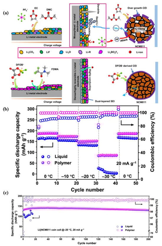 Z. Li and team recently reported on a new solid-state polymer electrolyte with remarkable ionic conductivity even at −20 °C. This electrolyte is created through in situ polymerization using a 1,3,5-trioxane-based precursor [50]. Utilizing this polymer electrolyte results in the formation of a two-layer solid electrolyte interphase on the lithium metal electrode, which stabilizes the positive electrode made of LiNi0.8Co0.1Mn0.1O2. The improved charge transfer at lower temperatures inhibits dendrite formation on the lithium metal electrode, enabling reliable operation of Li||LiNi0.8Co0.1Mn0.1O2 coin and pouch cells down to −30 °C. Notably, a Li||LiNi0.8Co0.1Mn0.1O2 coin cell cycled successfully at −20 °C and 20 mA g−1, maintaining over 75% (about 151 mAh g−1) of its initial discharge capacity after cycling at 30 °C with the same current density (as depicted in Figure 9b,c). Conversely, while liquid organic electrolytes in lithium-ion batteries can cause issues like inadequate ionic conduction and dendrite growth, the use of fluoroethylene carbonate (FDMA) containing electron-withdrawing groups assists in developing a favorable SEI layer rich in LiF and lacking Li2CO3, as depicted in Figure 9a.