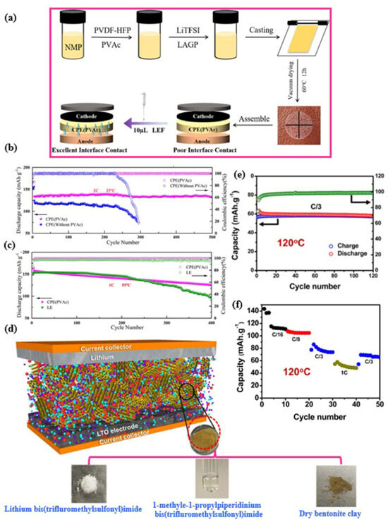 Researchers led by Dakun Song developed a rigid/flexible gel polymer electrolyte (GPE) labeled CPE(PVAc). This GPE, comprising PVDF-HFP/LAGP/PVAc/LiTFSI, was created using a straightforward solution casting technique (as shown in Figure 10a). The technique facilitated the creation of a stable solid electrolyte interphase (SEI) layer rich in LiF on the lithium anode, effectively preventing the growth of lithium dendrites. In lithium coin cells containing LiFePO4|CPE(PVAc)|Li, exceptional initial discharge specific capacities were achieved, with 135.4 mAh g−1 at 2 C and 25 °C, and 157.5 mAh g−1 at 1 C and 55 °C. Moreover, these cells exhibited impressive long-term cycling stability, maintaining 97.6% capacity after 500 cycles at 2 C @25 °C, and 80% capacity retention after 400 cycles at 1C @55 °C (as shown in Figure 10b,c) [65]. A newly designed quasi-solid-state electrolyte for high-temperature lithium-ion batteries has been introduced, combining the solidity of a solid structure with the fluidity of a liquid. This innovative electrolyte formulation consists of micro flakes of clay particles suspended in a solution of lithium-based room temperature ionic liquid, forming a quasi-solid system that maintains structural integrity even at temperatures up to 355 °C. Testing with a rechargeable lithium battery incorporating a Li4Ti5O12 (LTO) electrode demonstrated consistent capacity retention over 120 cycles (refer to Figure 10d). Figure 10e,f visualize the components employed in creating the clay−RTIL quasi-solid-state electrolyte and illustrate the envisioned structure of a lithium-ion battery [66].