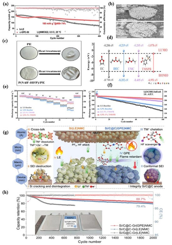 (a) Cycling performances of the Li||NMC622 batteries with b-LE and c-GPE-50 at 0.5 C. (b) SEM images, reproduced with permission from ref. [95], Elsevier. (c) Optical images of PE and (PVDF-HFP)/PE membranes before and after 30 min heat treatment at 135 °C. (d) Optimized structures and LUMO/HOMO energies of carbonate solvents (EC, DEC, EMC) in liquid electrolyte and TMSPB additive. (e) Cycling of Li||NCM811 half-cells with various electrolytes at different charge rates in the voltage range of 3.0–4.35 V. (f) Rate capability of Li||NCM811 cells in different electrolytes; reprinted with permission from [98]. Copyright © 2022, American Chemical Society. (g) Si-based anode||NMC full cell model, showing the fading mechanisms in the Si|LE|NMC prototype, including Si cracking, Li+ depletion, SEI rupture, and safety hazards. It also highlights the features of the Si/C@C|GPE|NMC system, emphasizing the Si/C@C anode design with improved interfacial stability, suppressed crosstalk effect, and flame retardancy of the GPE. (h) Electrochemical performance of the Si/C@C-Gr|GPE|NMC full cell, focusing on the cycling behavior of the cells, adopted from ref. [99], Springer Nature.