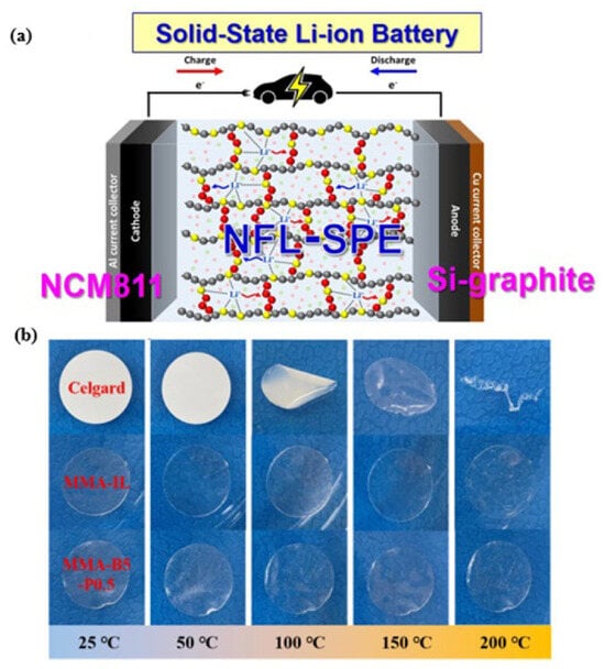 - Zhu, T.; Hao, X.; Cao, Y.; Li, T.; Li, Y.; Wang, W. Ultraviolet-cured heat-resistant and stretchable gel polymer electrolytes for flexible and safe semi-solid lithium-ion batteries. J. Power Sources. 2024, 613, 234944. [Google Scholar] [CrossRef]
