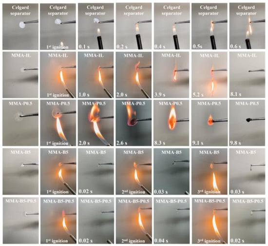 Another important safety aspect of gel polymer electrolytes is their mechanical strength. The gel-like consistency offers flexibility and resilience, enabling the electrolyte to endure physical stresses and prevent leaks. This mechanical robustness enhances the battery’s structural integrity, decreasing the chances of electrolyte exposure and associated risks [92]. The safety advantages of gel polymer electrolytes make them an attractive choice for lithium-ion battery applications demanding high safety standards, like electric vehicles and aerospace technologies. By mitigating risks related to thermal runaway, flammability, and mechanical issues, gel polymer electrolytes enhance the reliability and safety of battery systems. As battery technology continues to progress, the development of gel polymer electrolytes with enhanced safety features signifies a significant advancement. Future research endeavors may focus on optimizing gel electrolyte formulations and properties to meet the evolving requirements for safe high-performance lithium-ion batteries in various sectors. In summary, the improved safety characteristics of gel polymer electrolytes can potentially transform the landscape of lithium-ion battery technology, offering a safer and more dependable energy storage solution for a broad range of applications. By addressing critical safety concerns and reducing risks, gel polymer electrolytes play a pivotal role in elevating the safety standards of battery systems in today’s dynamic technological environment [93]. C. Wang and colleagues devised a dual-functional flame retardant (HCCP-TMP), merging hindered amine and cyclophosphazene to address both flame resistance and free radical scavenging. By incorporating just 1 wt% of HCCP-TMP, a polyacrylate-based GPE acquires non-combustibility. NCM811//graphite pouch cells coupled with this GPE exhibit resilience against combustion and mechanical stress. The NCM811/Li battery utilizing this non-flammable GPE demonstrates exceptional high-voltage cycling, with 82.2% capacity retention after 100 cycles at 2 C within 3.0–4.7 V, showcasing its robust performance (as shown in Figure 11d,e) [48,68,69,94]. In a separate investigation, a research initiative aimed to stabilize glymes at highly oxidizing electrode potentials by engineering self-limiting cathode electrolyte interfaces (CEIs) to elevate lithium-ion battery cathode efficiency and ensure the robustness of polymer electrolytes in high-voltage contexts, ultimately amplifying battery safety and efficacy [94]. In the absence of HCCP-TMP, PBA1190 underwent complete combustion post-flame exposure. In contrast, PBA1190-1 self-extinguished within 3 s, showcasing significant flame-retardant properties (as shown in Figure 11f). Residual char from the thermal degradation of PBA1190 and PBA1190-1 at 500 °C was collected. Refer to Figure 11g for digital and SEM images of both materials before and after combustion. The novel design of a multifunctional gel polymer electrolyte (GPE) effectively tackles issues related to lithium dendrite growth and cathode stability. By integrating barium titanate (BTO) and hexagonal boron nitride nanosheets (h-BNNS) into a polyvinylidene fluoride-hexafluoropropylene (PVDF-HFP) matrix using electrospinning, the GPE demonstrated impressive performance. The Li/NCM-523 battery exhibited excellent rate capability and cycling stability, maintaining 80% capacity after 170 cycles at 0.5 C. Similarly, the Li/NCM-811 battery sustained 81% capacity after 100 cycles at 0.5 C. Different GPE variations, such as n-GPE, bto-GPE, and c-GPE-1 to c-GPE-3, were created through immersion in a liquid electrolyte solution. Testing indicated that the Li/c-GPE-3/Li cell showed stable voltage over 310 h, highlighting effective dendrite suppression and interface stability provided by c-GPE-2 (as shown in Figure 11h) [69].