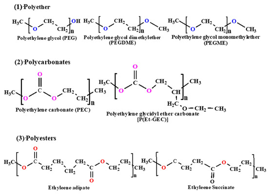 In the realm of solid-state battery technology, the formulation of solid-polymer electrolytes (SPEs) represents a crucial advancement achieved by embedding lithium salts within a polymeric matrix to bolster ionic conductivity. Within the intricate structure of SPEs, the process of lithium salt dissolution unfolds through a sophisticated interplay between the Li ion and the electron-rich polymer backbone [20], a dynamic interaction that plays a pivotal role in fostering enhanced ionic conductivity within the system, as evidenced by prior research findings [21,22]. The transition from conventional liquid electrolytes to SPEs in LIBs heralds a paradigm shift, offering a myriad of benefits ranging from nonvolatility to heightened mechanical flexibility and elevated safety standards, underscoring the transformative potential of solid-state battery technologies [20,23]. Delving deeper into the spectrum of polymer backbones utilized in SPE design for LIB applications reveals a rich landscape of materials, among which polyethylene oxide (PEO) emerges as a standout candidate. PEO’s distinctive composition, characterized by flexible segments of ethylene oxide and atoms of ether oxygen endowed with potent donor characteristics, renders it an ideal solid solvent for lithium salts, enabling seamless solvation of Li+ cations essential for battery operation and efficiency. The common polymer backbone for solid polymer electrolytes for LIBs is represented in Scheme 2. Despite its inherent virtues, the solid nature of polymer frameworks presents a unique challenge, impeding SPEs from establishing a seamless interface with electrodes akin to that observed in liquid electrolytes. Consequently, the interfacial interaction between SPEs and electrodes is confined to the discrete contact area on the electrode surface, giving rise to heightened interfacial impedance that can directly influence the battery’s overall efficiency and lifespan system. Gel polymer electrolytes and other polymer electrolytes’ ionic conductivity, mechanical properties, and thermal stability comparison are shown in Scheme 3.