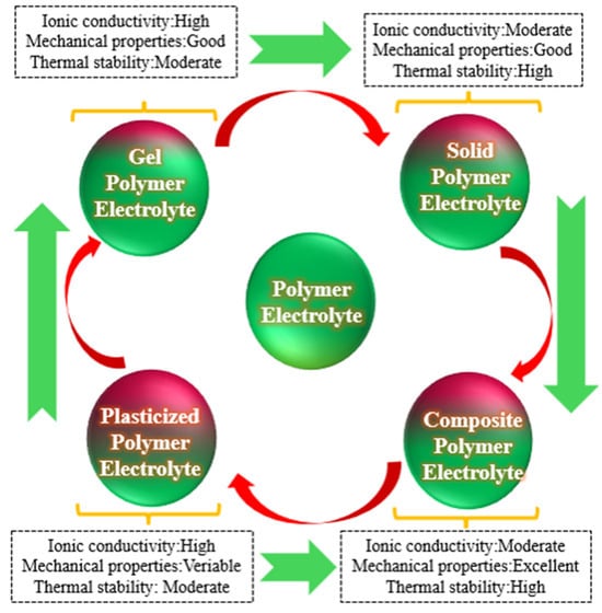 Comparison of gel polymer electrolytes and other in terms of ionic conductivity and mechanical properties, polymer electrolytes properties, and thermal stability.