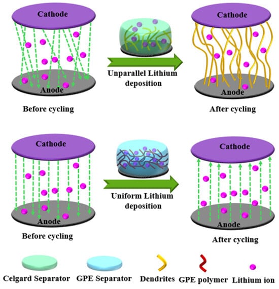 Gel polymer electrolytes (GPEs) are extensively utilized in lithium-ion batteries due to their enhanced safety, mechanical stability, and flexibility. They reduce risks of leakage and flammability compared with liquid electrolytes and enhance energy density with higher voltage operation. GPEs ensure efficient energy storage and transfer, making them ideal for consumer electronics, electric vehicles, and renewable energy storage systems. In modern lithium-ion batteries utilizing high-nickel cathodes like NCM and NCA, and materials such as LiFePO4, GPEs are increasingly preferred over traditional liquid electrolytes due to their myriad advantages [43,50,73]. High-nickel cathodes boast exceptional energy density and capacity, making them crucial components for high-performance applications in electric vehicles and advanced electronics. LiFePO4, known for its outstanding thermal stability, extended cycle life, and safety features, is ideal for applications prioritizing robust and consistent performance. However, despite their benefits, these materials face challenges related to safety issues, thermal instability, and accelerated degradation, which GPEs can effectively address. GPEs offer significant safety enhancements over liquid electrolytes by minimizing risks of leakage and flammability due to their semi-solid composition, bolstering overall safety. They also deliver enhanced mechanical stability, which helps mitigate volume changes and mechanical strains experienced during charge–discharge cycles by high-nickel cathodes and LiFePO4, thereby preserving battery integrity. Additionally, GPEs support the high-voltage operations characteristic of NCM and NCA cathodes while being compatible with the lower voltage range of LiFePO4, crucial for optimizing energy density and effectiveness across diverse battery chemistries. Significant improvements in polymer matrix technologies, such as PVDF, PAN, and PEO, have greatly enhanced the ionic conductivity of GPEs [30,31,74]. These polymers, paired with lithium salts like LiPF6, LiBF4, and LiTFSI, create conductive and stable gels that prolong battery cycling life. Furthermore, GPEs form a more stable solid-electrolyte interphase (SEI) with high-nickel cathodes and LiFePO4 compared with liquid electrolytes, reducing electrolyte degradation and cathode damage to enhance battery longevity. Despite the initial higher costs and synthesis complexities of GPEs, their long-term advantages, including enhanced safety, improved thermal stability, and extended operational life, position them as a compelling alternative. Ongoing research endeavors are continuously addressing these challenges, making GPEs a more attractive option for high-energy applications demanding enhanced performance and dependability. Thus, GPEs represent a significant innovation in creating safer, more efficient, and longer-lasting lithium-ion batteries utilizing high-nickel and LiFePO4 cathodes [66,75].