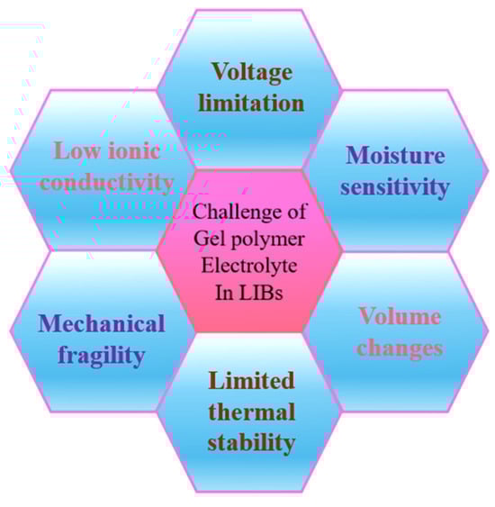 Gel polymer electrolytes (GPEs) present numerous advantages over traditional liquid organic electrolytes, particularly in battery applications. One of their key strengths lies in their enhanced safety features, as the semi-solid nature of GPEs reduces the risks of leakage and flammability associated with liquid electrolytes, promoting device safety [70]. Additionally, the gel structure of GPEs provides superior mechanical stability, ensuring structural integrity even under physical stress, leading to enhanced battery longevity and reliability. Moreover, GPEs exhibit lower volatility compared with liquid electrolytes, extending battery lifespan and enhancing thermal stability across various temperature ranges. The ability of GPEs to operate at higher voltages benefits high-energy applications by improving energy density and overall performance. Furthermore, GPEs display increased resistance to electrolyte decomposition, maintaining ionic conductivity for efficient energy storage and transfer [71]. This combination of high ionic conductivity and mechanical robustness presents GPEs as a balanced alternative to liquid organic electrolytes, addressing historical safety and performance concerns associated with conventional systems. However, challenges exist with GPEs that require attention. These include lower ionic conductivity compared with liquid electrolytes, potentially affecting battery performance, especially in colder temperatures. The intricate and costly production processes of GPEs, involving precise polymerization and the incorporation of ionic salts and plasticizers, lead to higher manufacturing expenses. Limited compatibility with certain electrode materials may compromise the stability of the electrode/electrolyte boundary, with impact on long-term battery performance. Despite offering improved mechanical stability, GPEs can experience dehydration or swelling under extreme conditions, potentially affecting functionality and lifespan. Additionally, the relatively slower ion transport in GPEs compared with liquid electrolytes can limit rate capability and influence battery power performance. Nonetheless, ongoing research and development initiatives are dedicated to overcoming these challenges to enhance the performance and commercial viability of gel polymer electrolytes [72].
